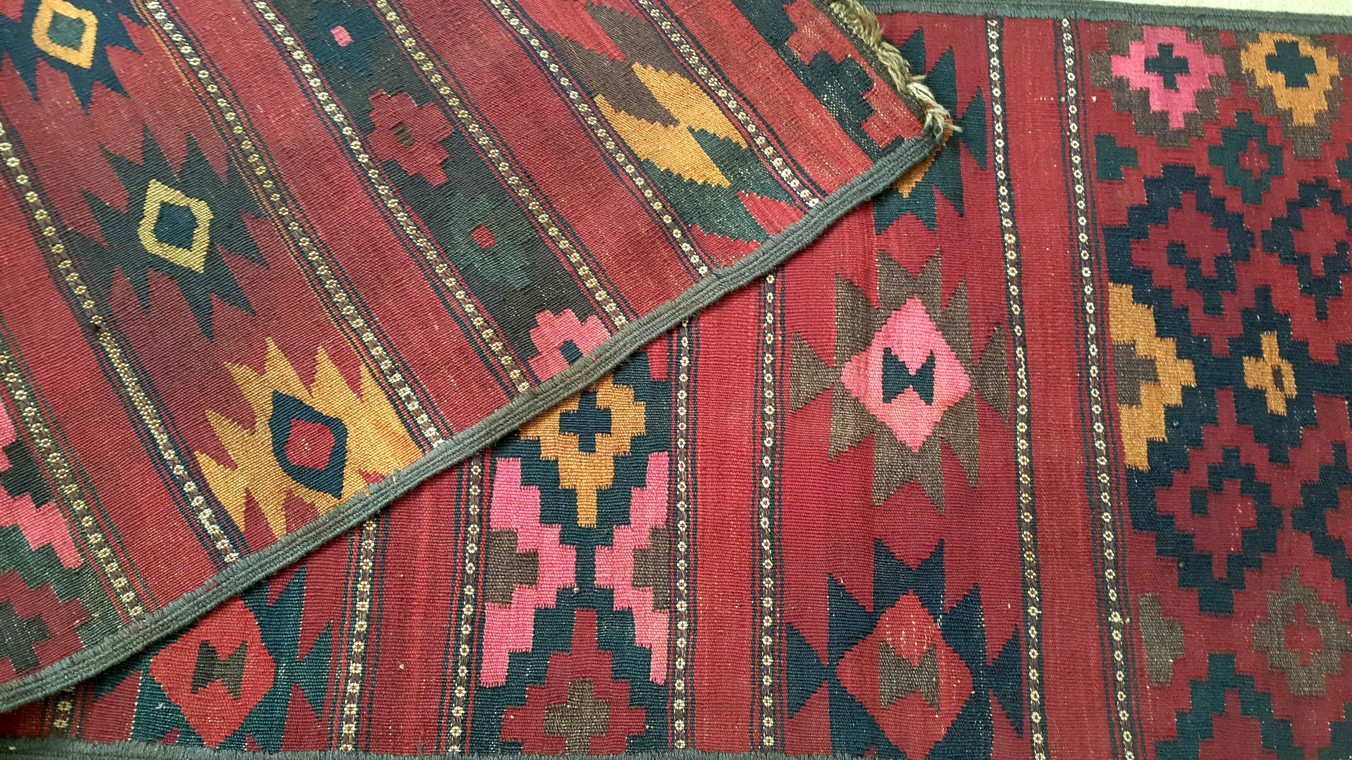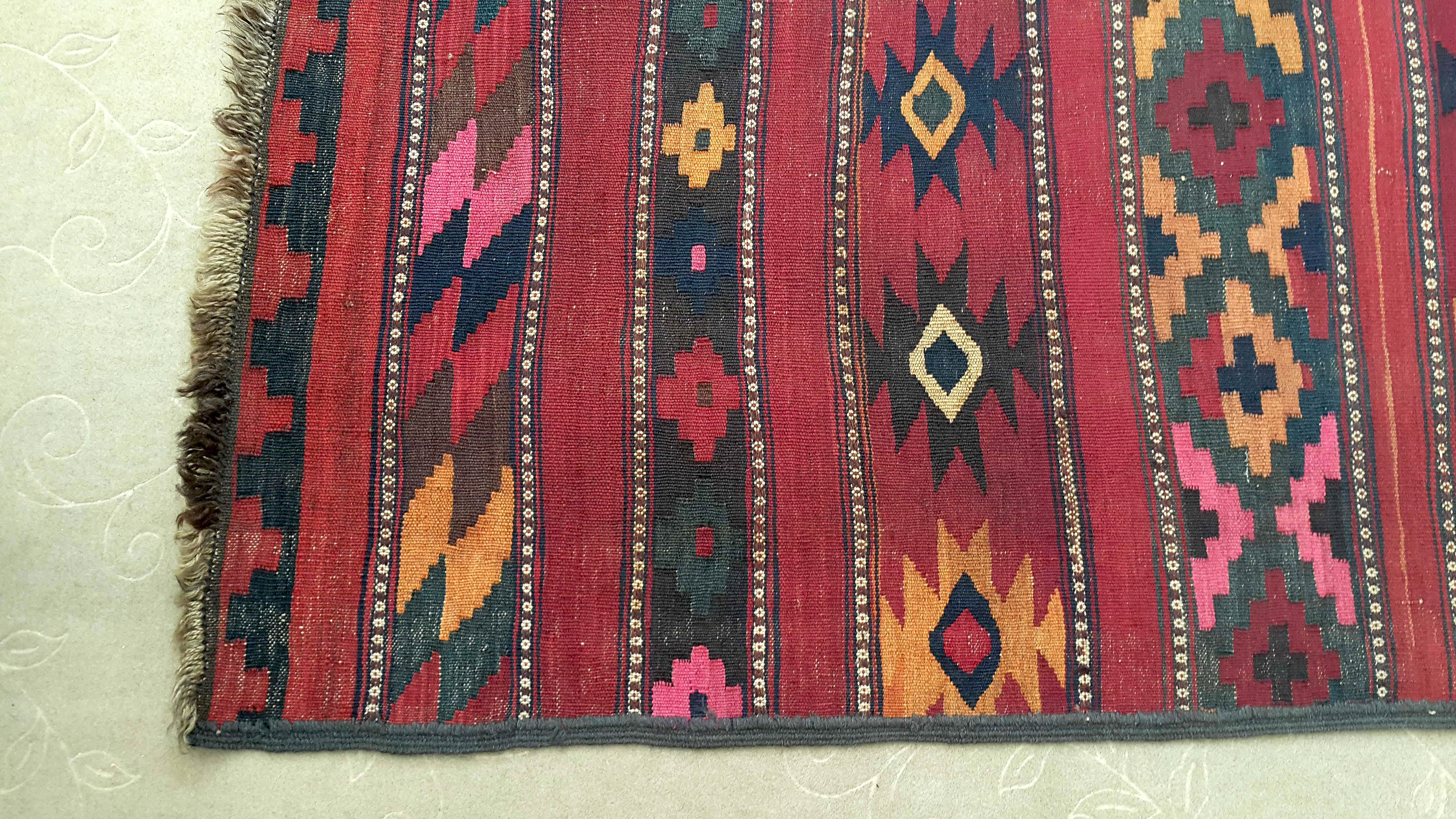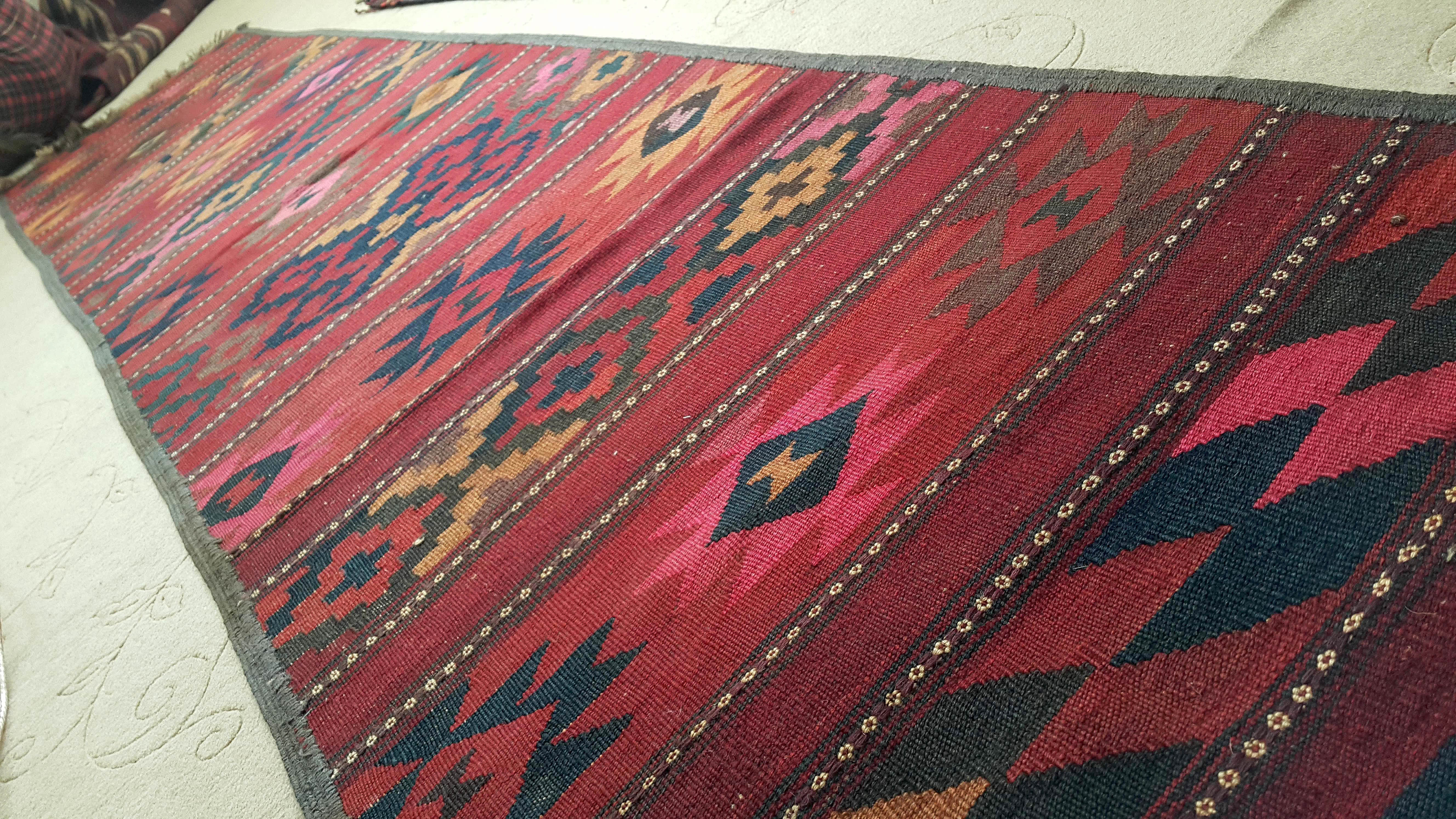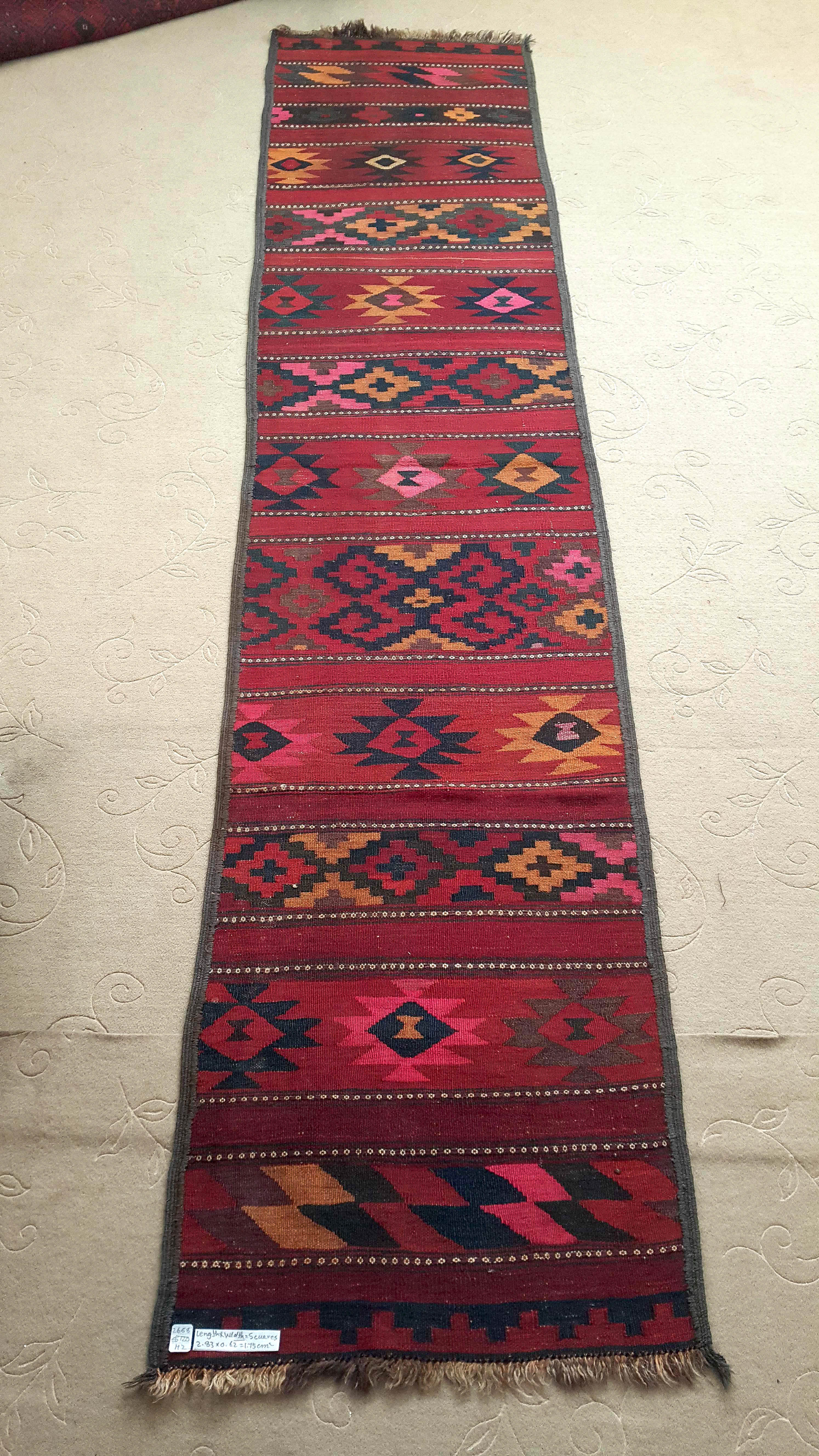 Very nice runner with a red background in a Mayaman style, from Maimana in north Afghanistan. The rug has been washed and is a bit distorted on the extremities. Very good overall state. Ideal for pimping up your corridor.